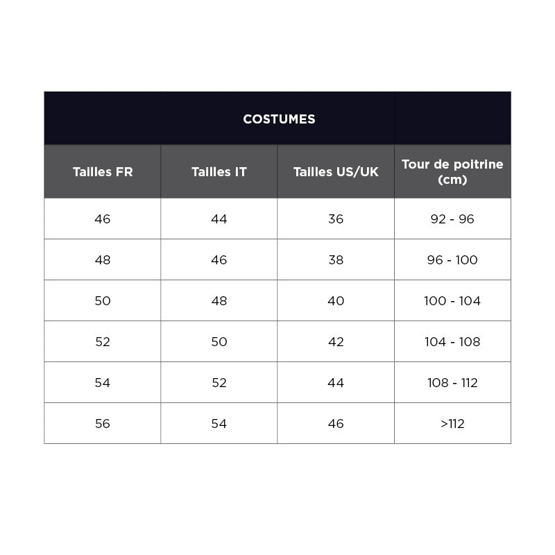 Généralement, les tailles de nos costumes sont exprimées en "taille Italienne".