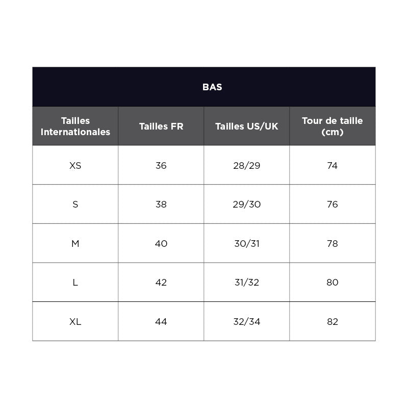 Pour mesurer, placez le mètre ruban autour de votre taille naturelle, au niveau où vous portez habituellement vos pantalons puis référez vous au tableau.