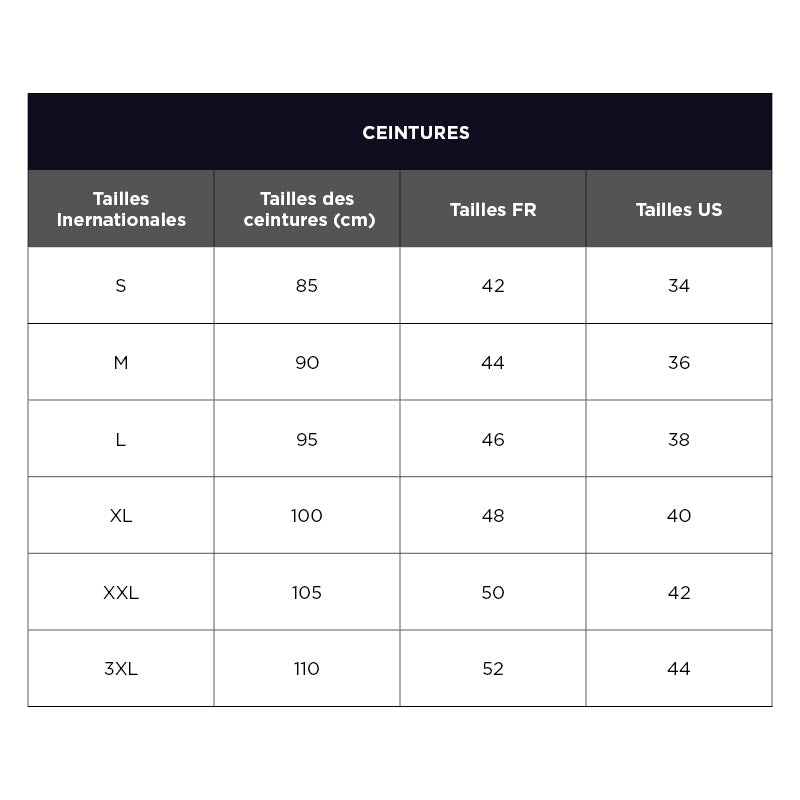 Les ceintures se mesurent en centimètres, de la boucle jusqu’au trou central. Pour choisir, basez-vous sur votre tour de taille ou la taille de votre pantalon.