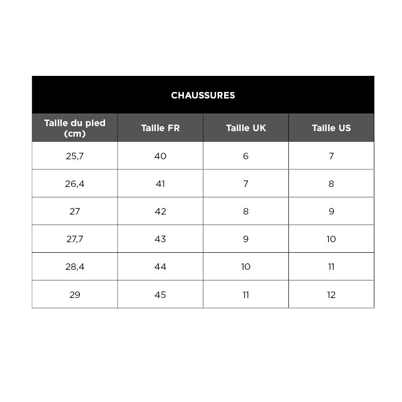 La pointure correspond à la longueur du pied en centimètres. Pour mesurer, placez votre pied sur une feuille, tracez le contour et mesurez la distance du talon à l’orteil le plus long.