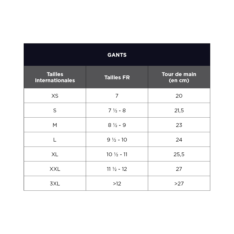 Pour bien choisir votre taille, basez vous sur la circonférence de votre main et consultez le tableau correspondant. Contactez-nous si besoin.