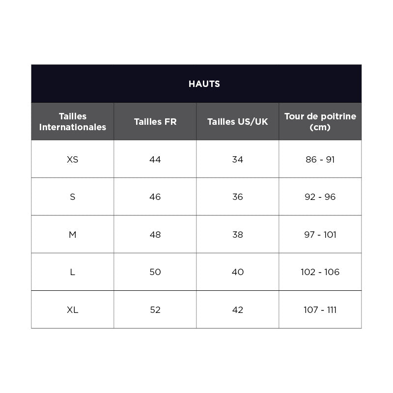 Pour bien choisir vos hauts, mesurez votre tour de poitrine : placez un mètre ruban sous vos aisselles, bien à plat et sans serrer, puis reportez la mesure dans le tableau.