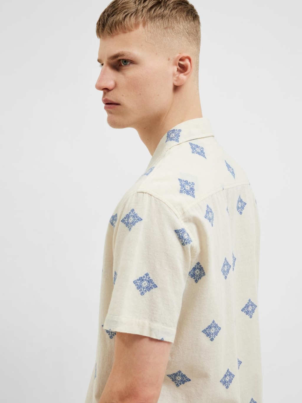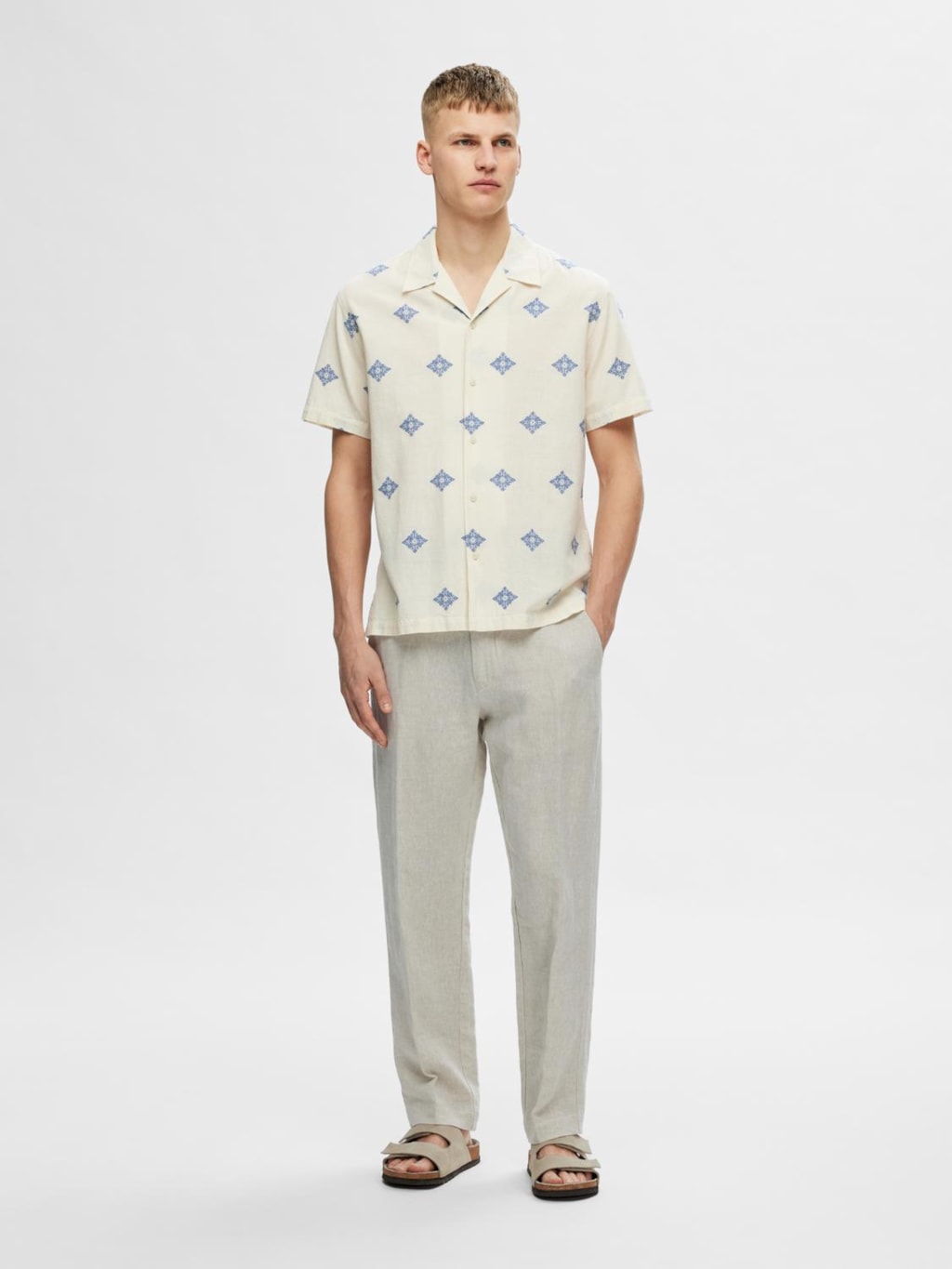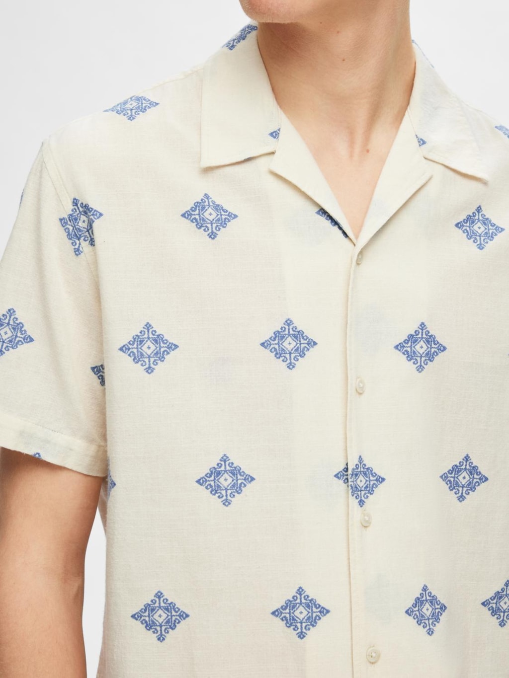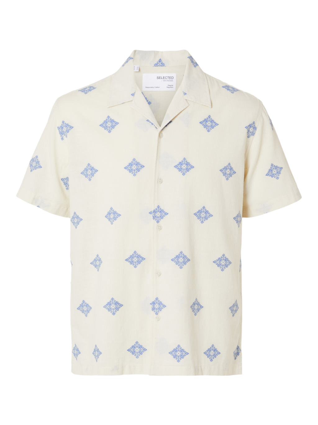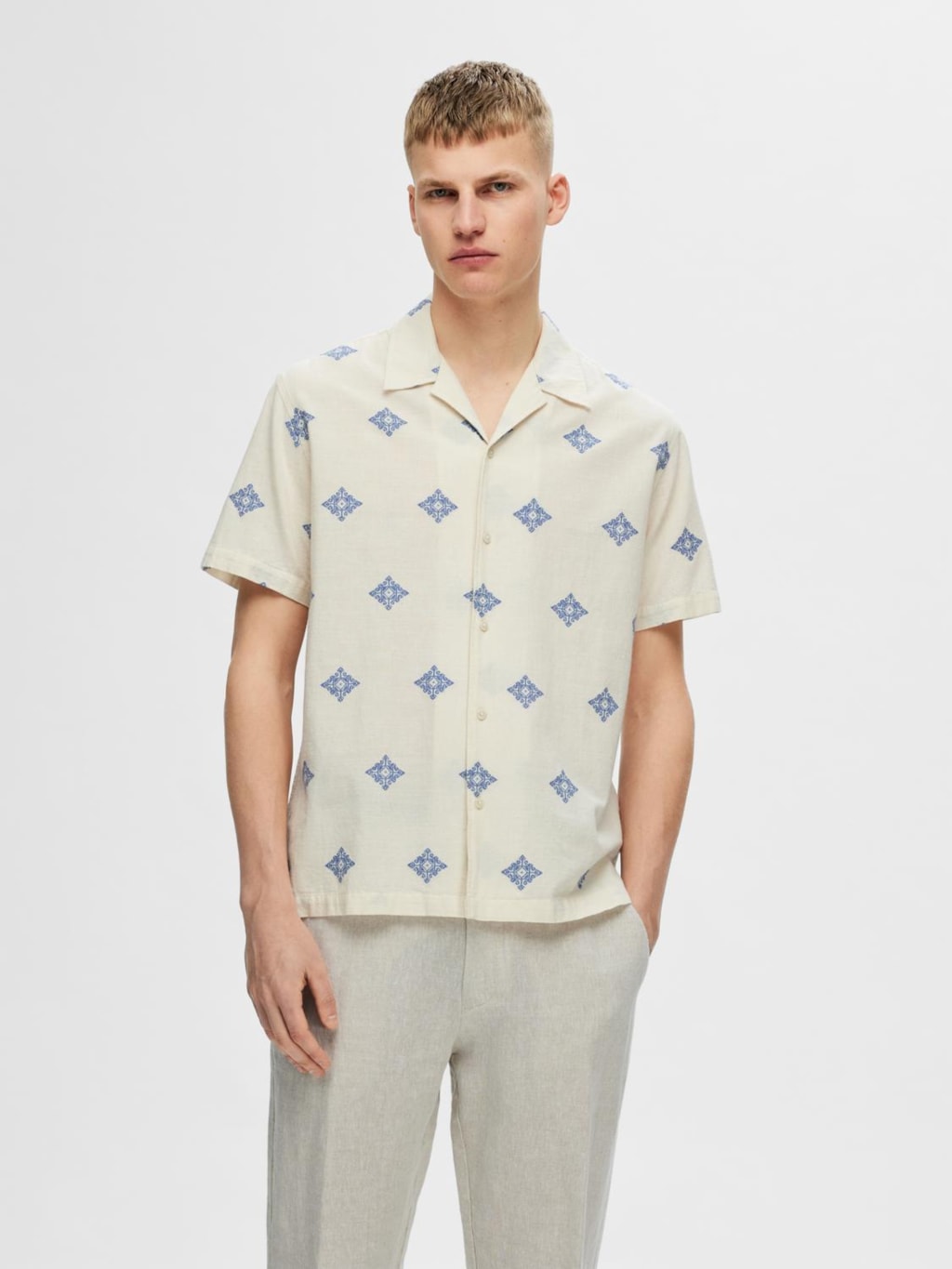 La chemise à manches courtes Regular Eric Shirt SS Fil Copé, couleur Egret avec Broderie Aop de Selected est l'option idéale pour cette saison.