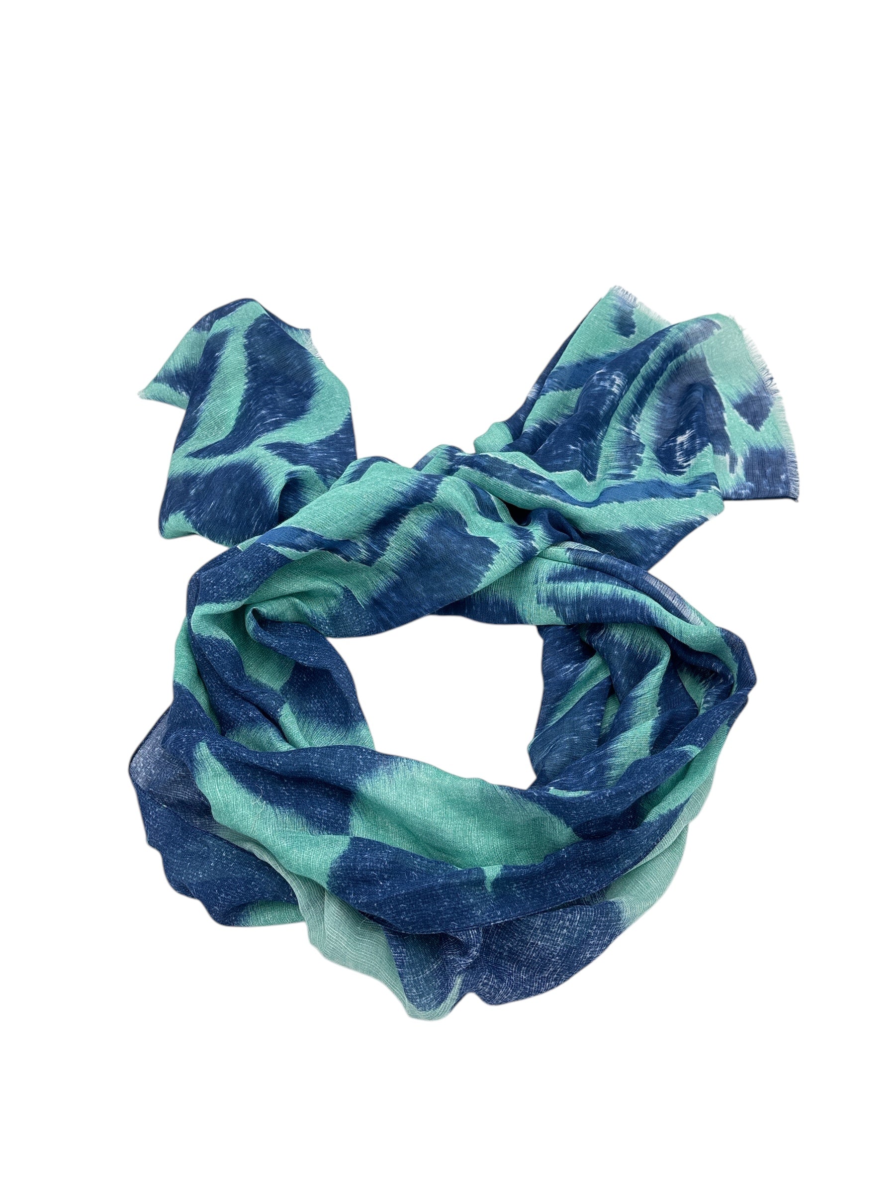 Sa palette fraîche et vibrante marie un bleu profond à un vert turquoise lumineux, dans un motif moderne qui attire le regard. Cette association de teintes dynamiques confère à l’écharpe une élégance contemporaine et une énergie raffinée, capable de rehausser instantanément n’importe quelle tenue.