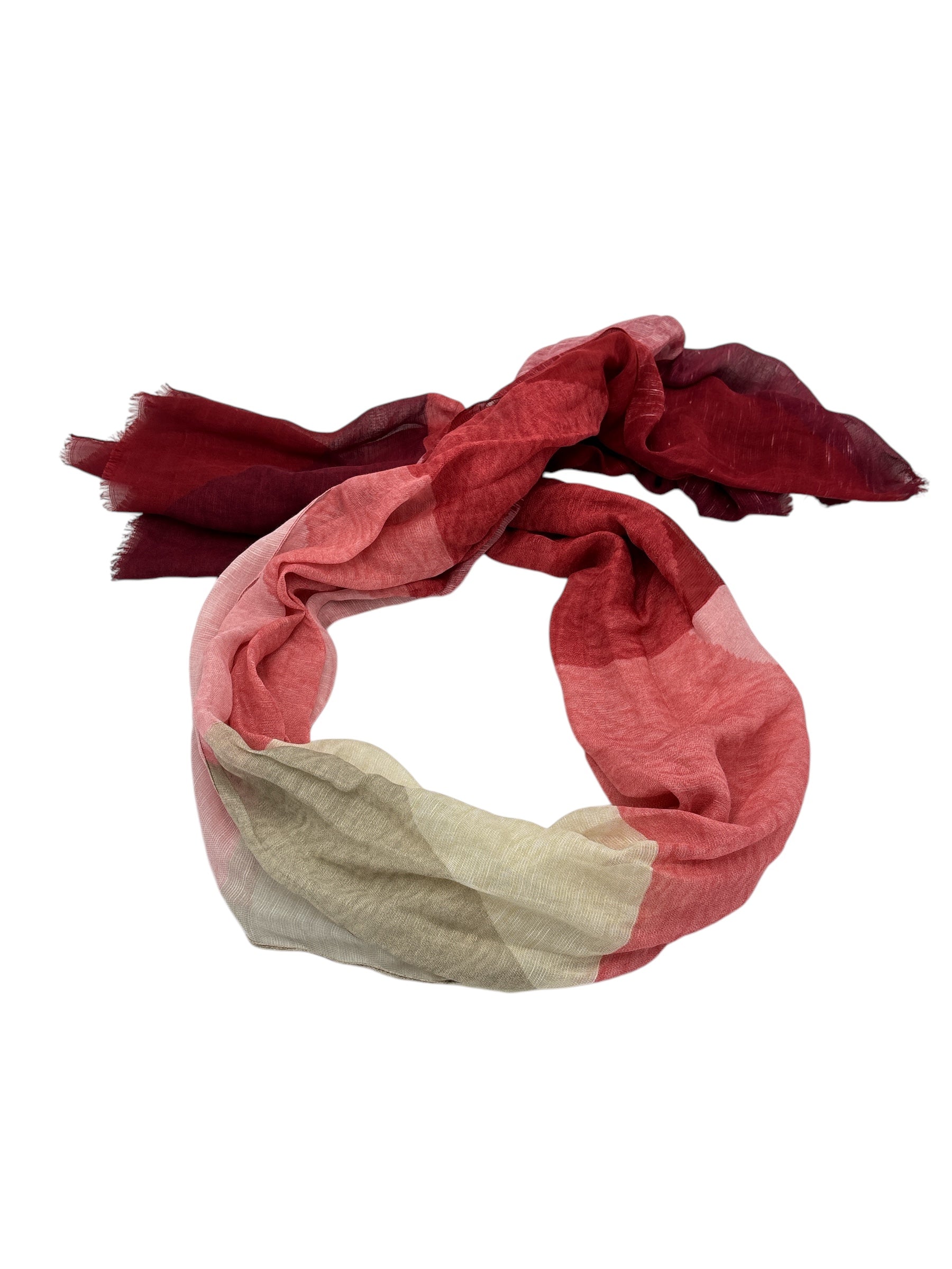 Son dégradé raffiné de bordeaux, rouge et rosé, ponctué d’une nuance sable lumineuse, crée une harmonie à la fois chaleureuse et sophistiquée. Cet accessoire polyvalent apporte une note élégante à une tenue casual comme à une silhouette plus habillée.