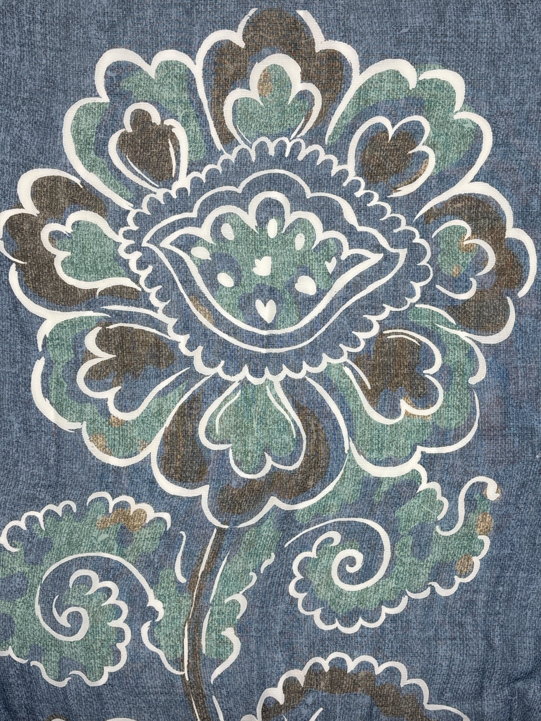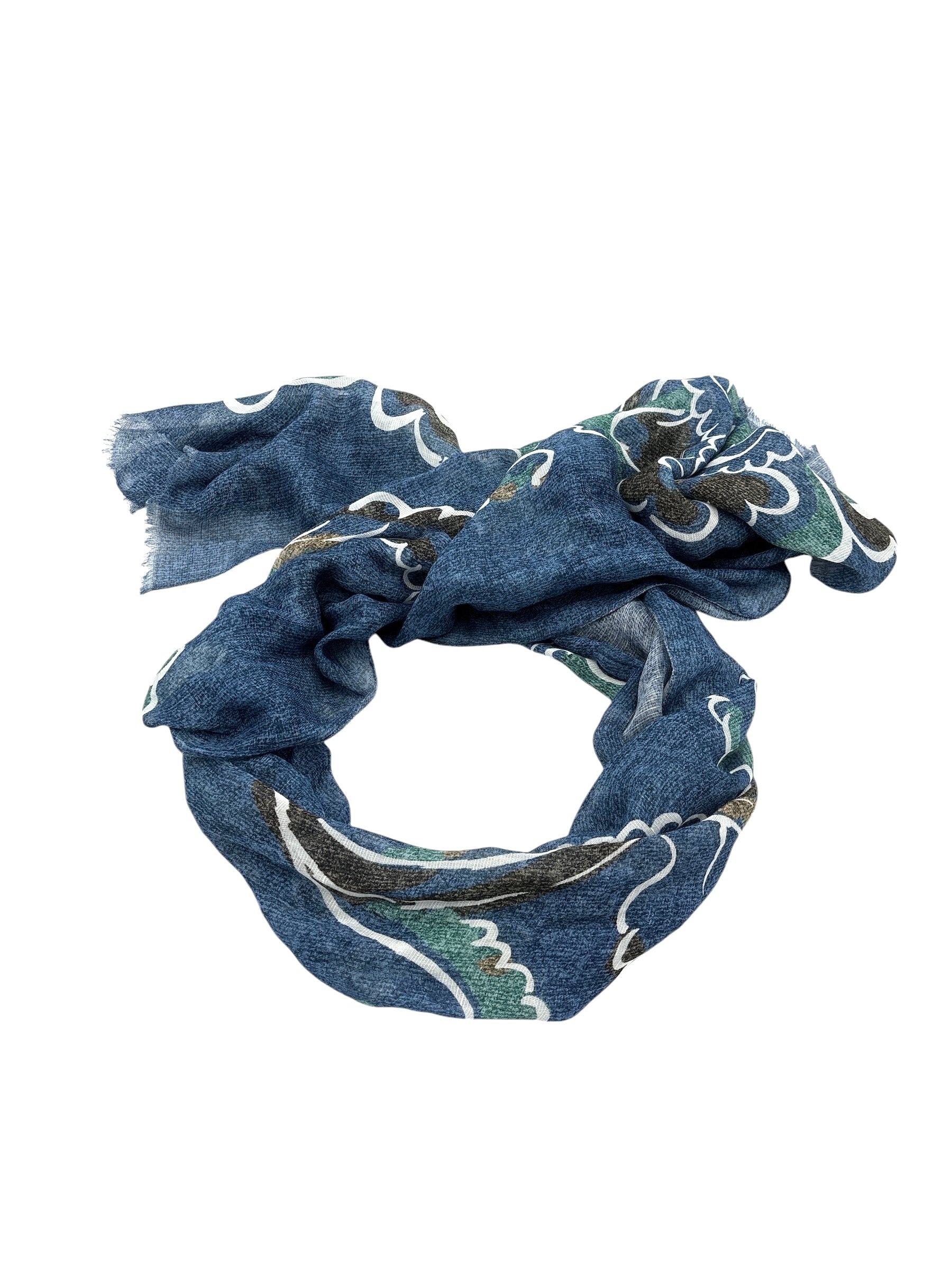Sur un fond bleu chiné délicat, son motif ornemental se décline en nuances de vert et de marron, créant un contraste harmonieux entre fraîcheur et chaleur. Élégante et originale, elle se porte aussi bien pour rehausser une tenue casual que pour sublimer un style plus habillé.